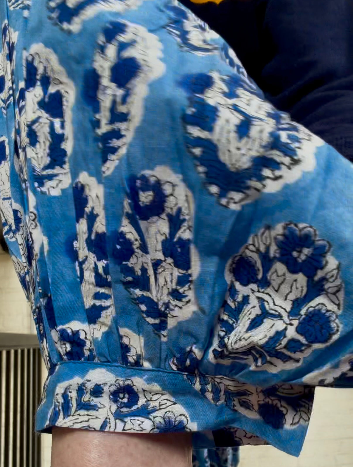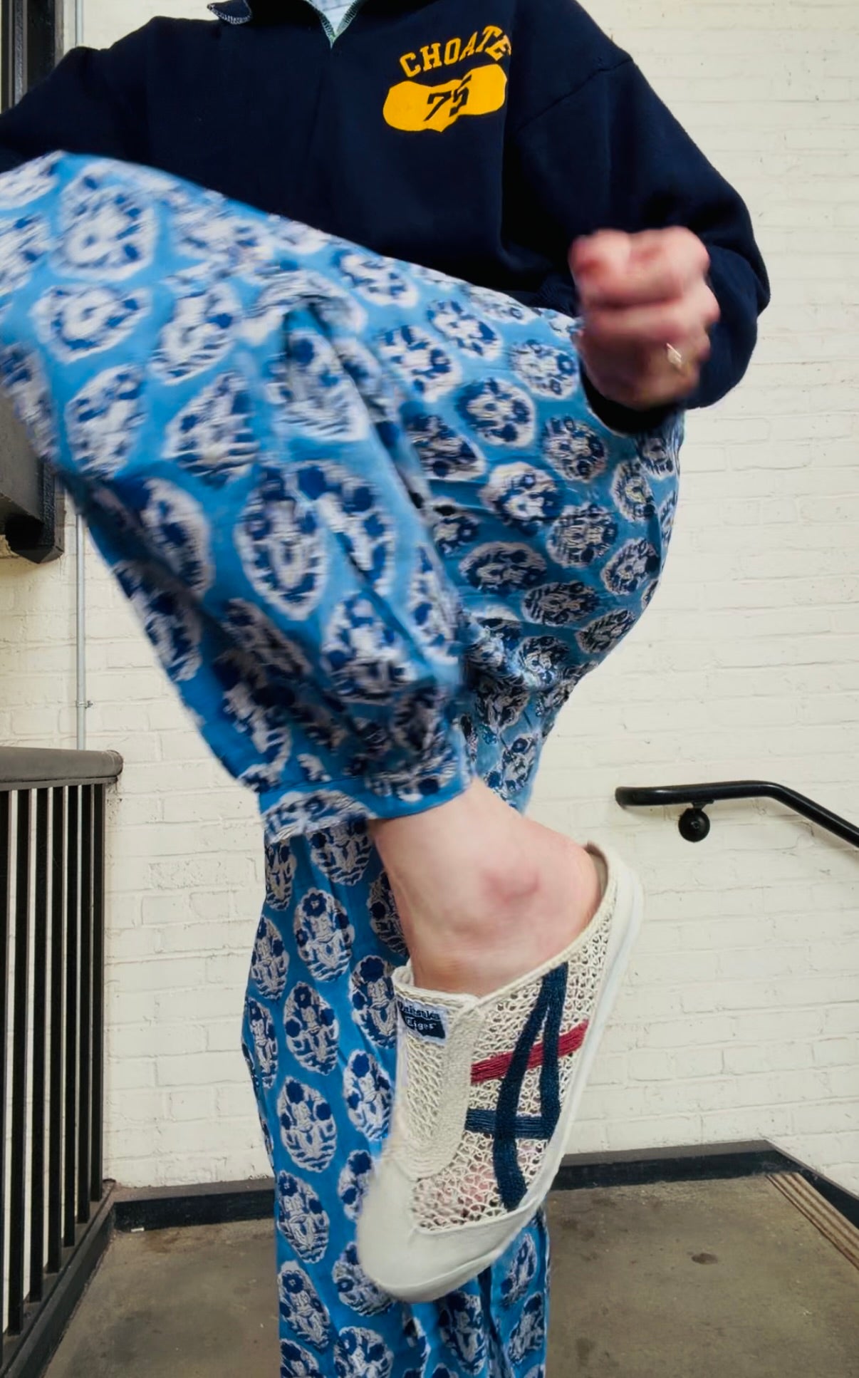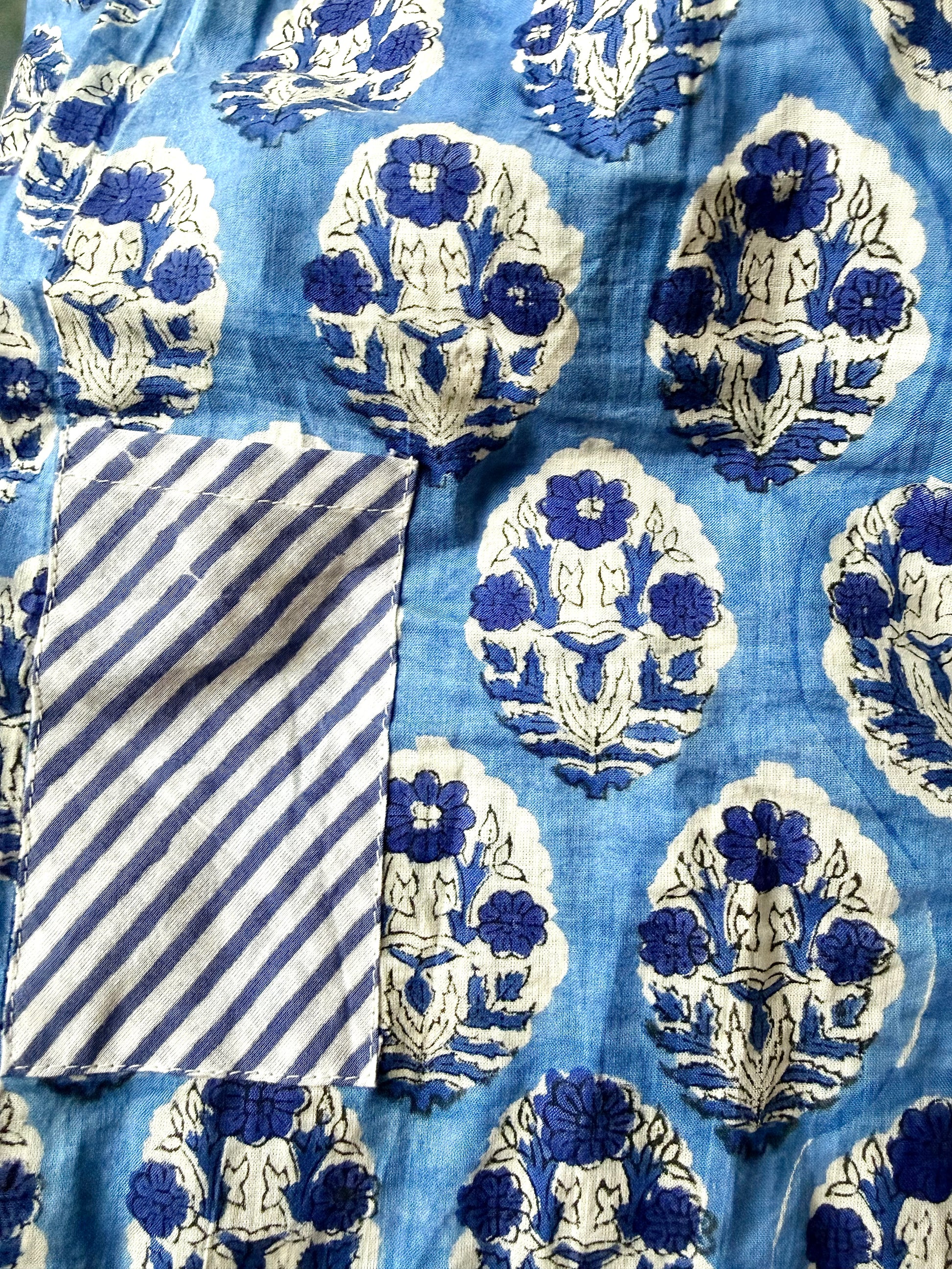 Designed for vacay when you want to hit the pool or beach with a book and a room key. Elasticized waist with decorative drawstring, wide spacious straight legs with tiny pleats collecting at a 1" band above the ankle. Made from the hand block printed fabric we source in Jaipur with weightless hand and vibrant colors.
