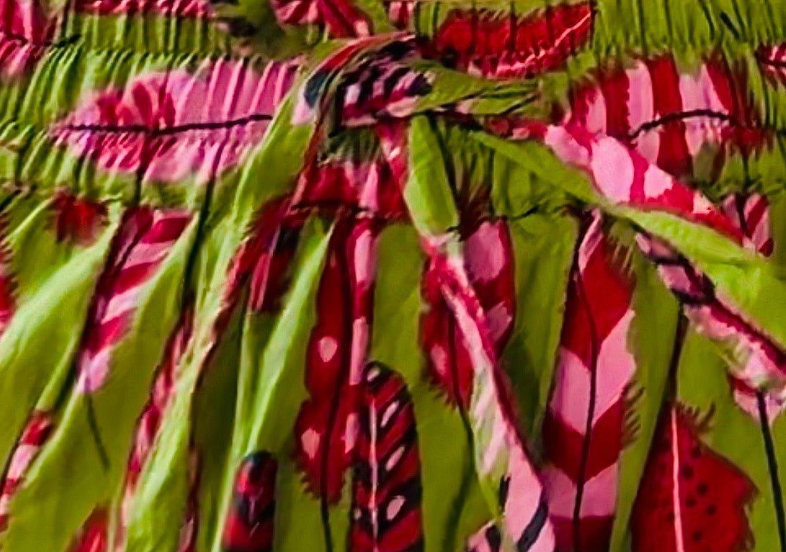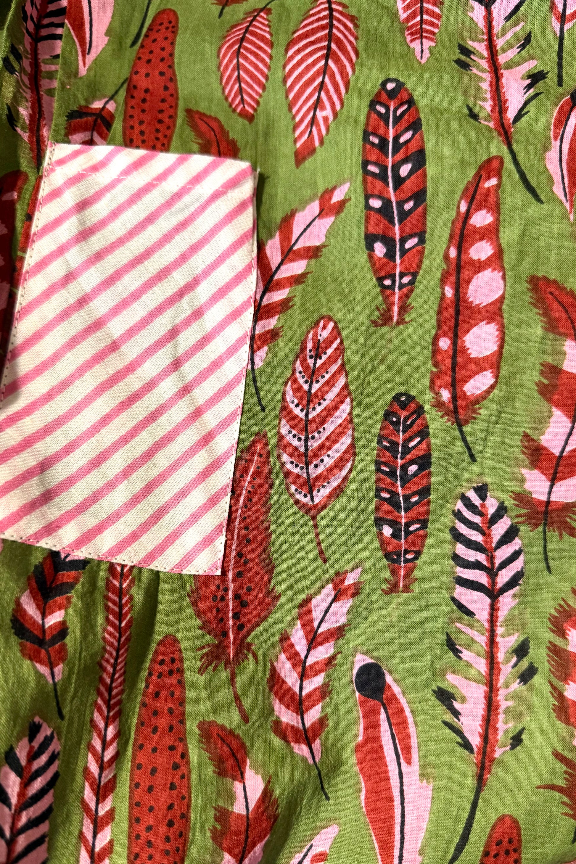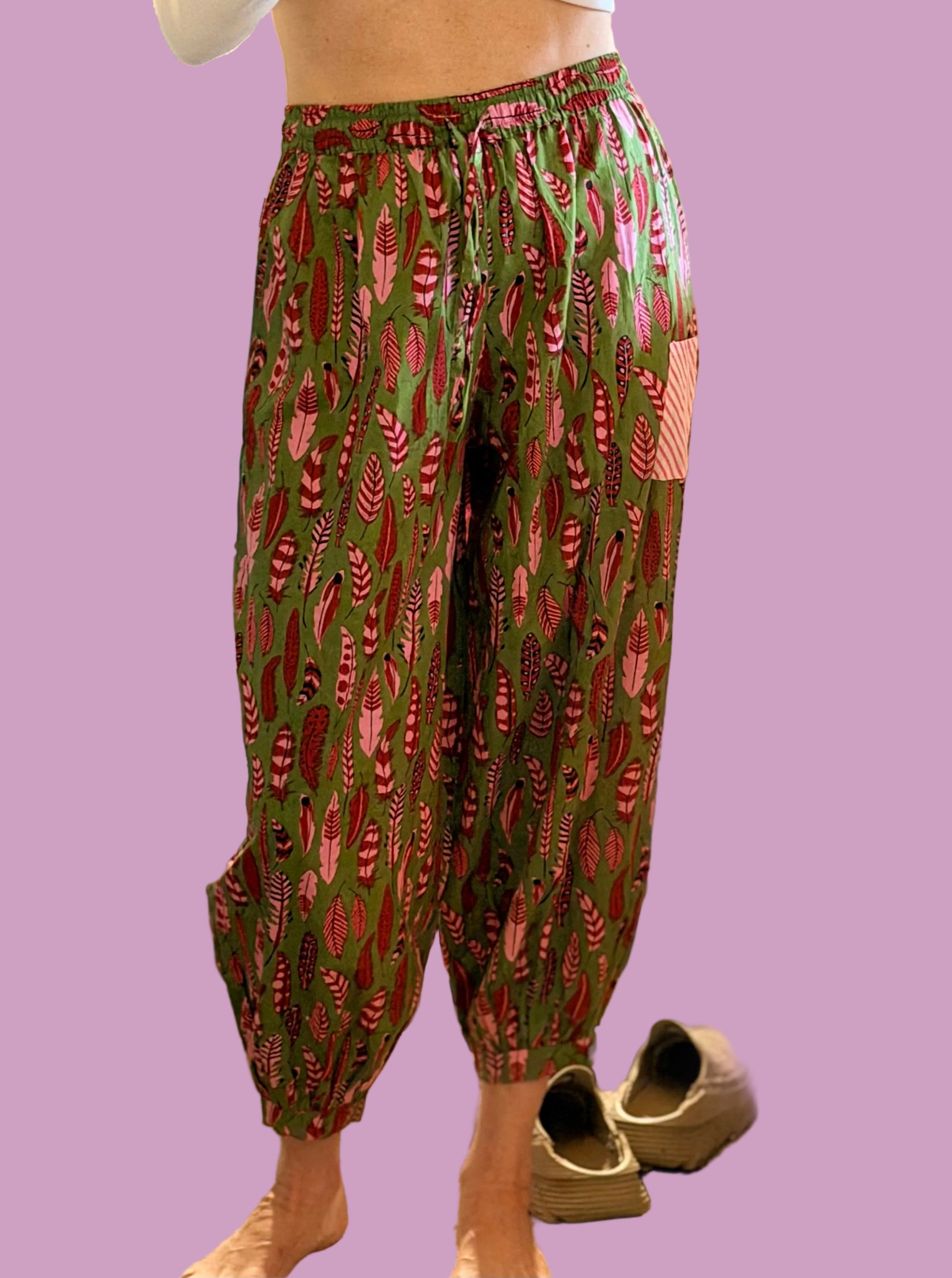 Designed for vacay when you want to hit the pool or beach with a book and a room key. Elasticized waist with decorative drawstring, wide spacious straight legs with tiny pleats collecting at a 1" band above the ankle. Made from the hand block printed fabric we source in Jaipur with weightless hand and vibrant colors.