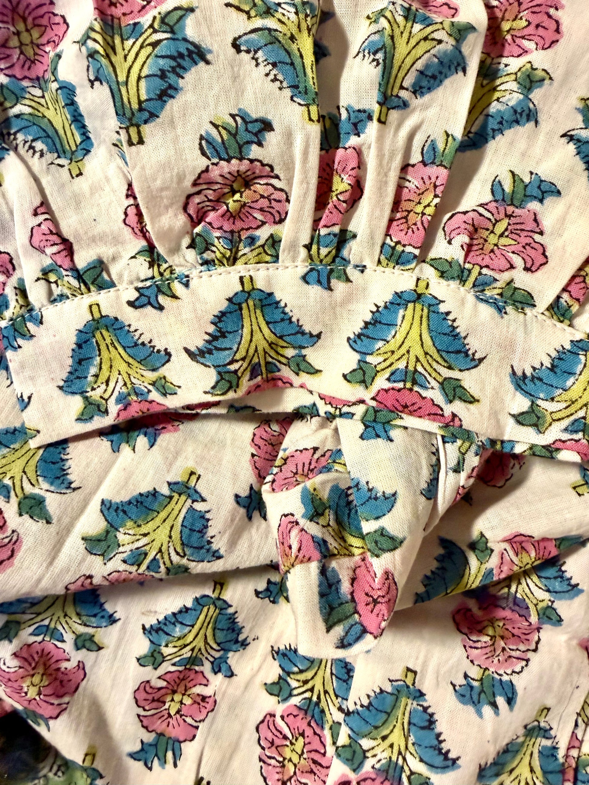 Designed for vacay when you want to hit the pool or beach with a book and a room key. Elasticized waist with decorative drawstring, wide spacious straight legs with tiny pleats collecting at a 1" band above the ankle. Made from the hand block printed fabric we source in Jaipur with weightless hand and vibrant colors.
