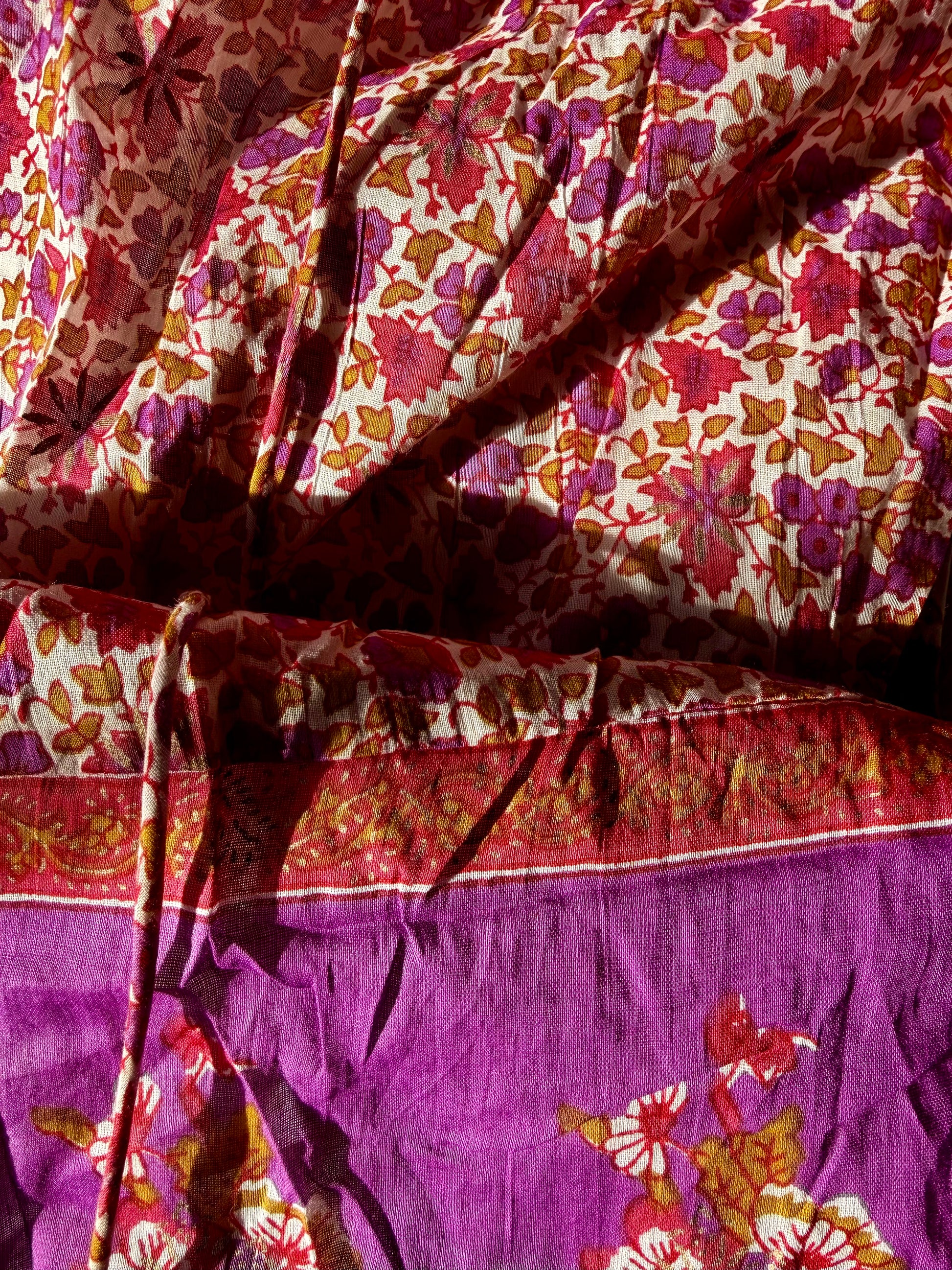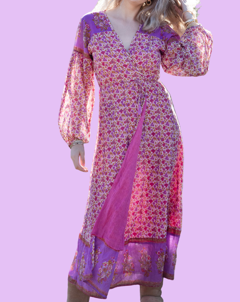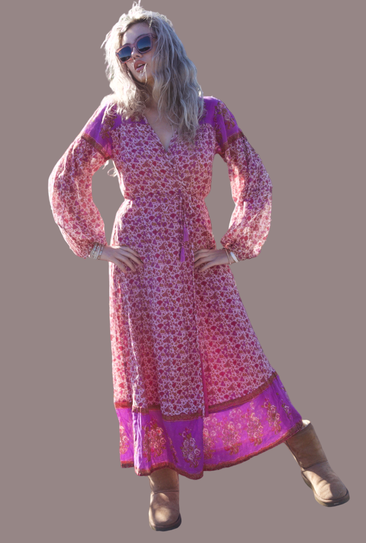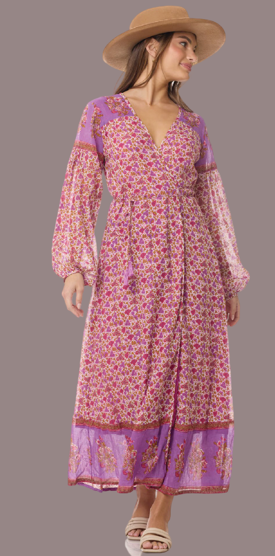 Designed in France by Blue Boheme. Easy and breezy- she's long sleeved and fully lined from bodice knee in tissue-thin voile. The full sleeves are transparent w/ elasticized cuffs.